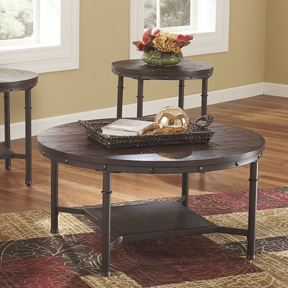 Saber legs add shapely flair. Vintelli 3-Piece Occasional Table Set by Signature Design in Occasional Table Sets. Made with select inlay veneer and hardwood solids in a textured dark grayish brown finish.