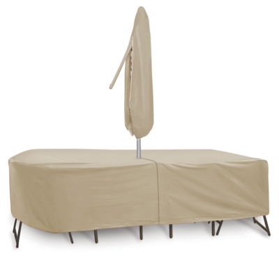 OvalRectangular Table and Chairs Combo Covers include built in Velcro secure ties. Umbrella cover sold separately. 7-millimeter vinyl shell UV-treated to withstand sun exposure.